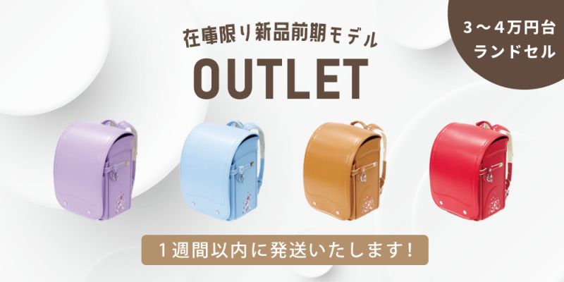 昨年度以前に、展示会やショールームで展示品として使用したランドセルをアウトレットとして提供中。肩ベルトや自動ロック錠を中心に使用感がありますが、6年間の品質保証つき。値段は19,800~と非常にお得。