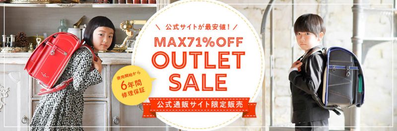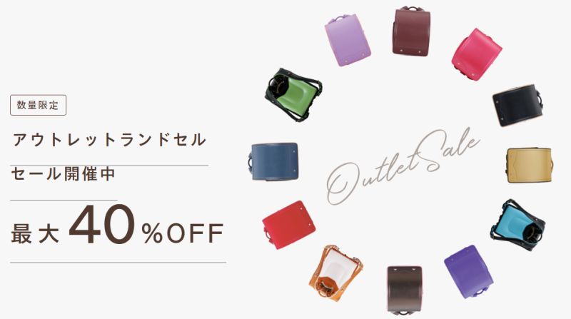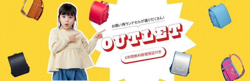 期間限定・数量限定でアウトレットセールを実施中。割引率は最大45%OFF。フィットちゃん背カンや安ピカッ、楽ッションを搭載した背負いやすいランドセルが3万円台~5万円台で購入できます。もちろん6年間の品質保証つき。