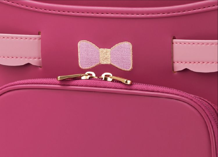 リボンのチャームとバイカラーが可愛さを引き立てます。少し短いカブセに取り付けられた差し込み錠前もアクセントになっています。
