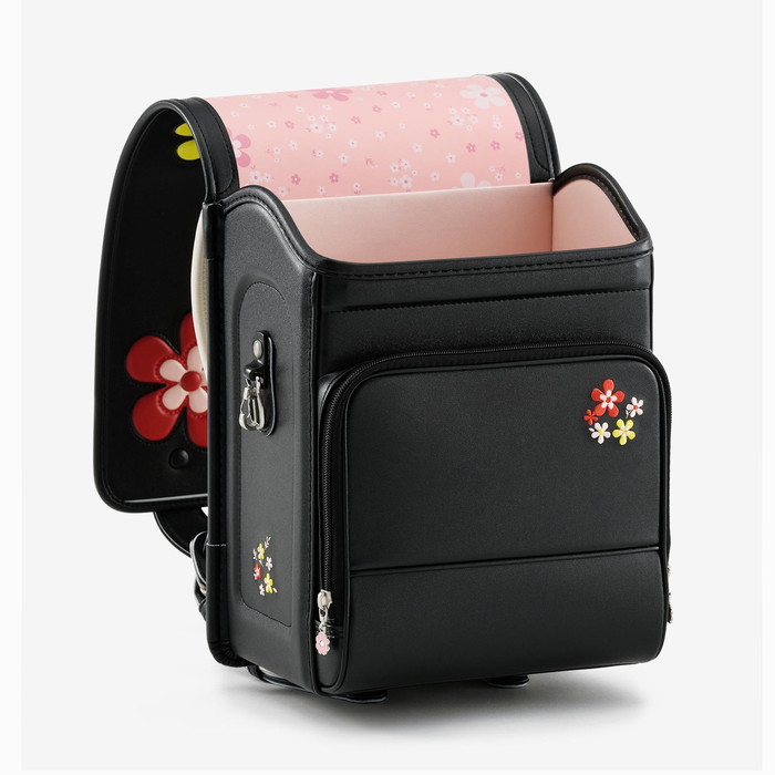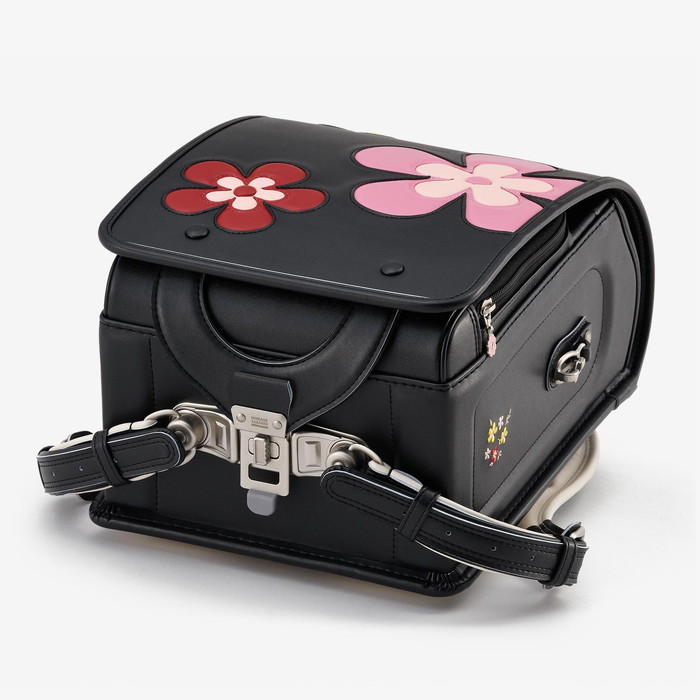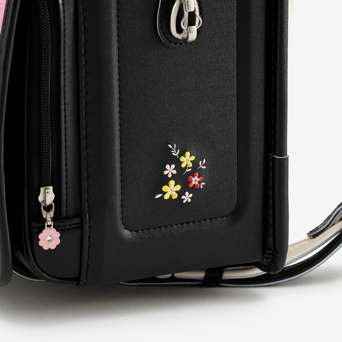 前ポケットのファスナー引き手やサイドの安全フックにも、同じ花のモチーフが使われています。