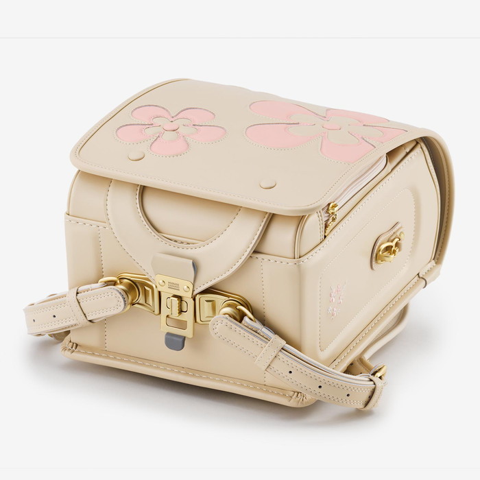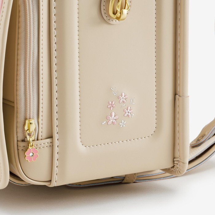 前ポケットのファスナー引き手やサイドの安全フックにも、同じ花のモチーフが使われています。