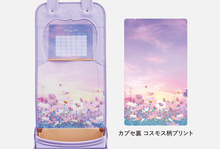 NASAのために開発された衝撃吸収材を使った「地球NASAランドセル®」シリーズに、女の子向けの軽量キューブ型モデルが加わりました。反射材やカブセ裏などに、モチーフのコスモスをあしらった、とってもかわいいランドセルです。