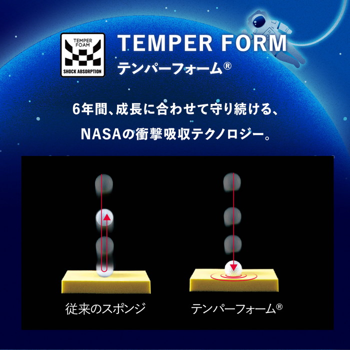 NASAのために開発された衝撃吸収材。スペースシャトルの座席に使用されていました。この高密度な低反発素材を肩ベルトと背あてに採用することで、お子様の体にランドセルがフィットします。肌あたりがよく、吸湿性・速乾性にも優れ快適に背負っていただけます。
