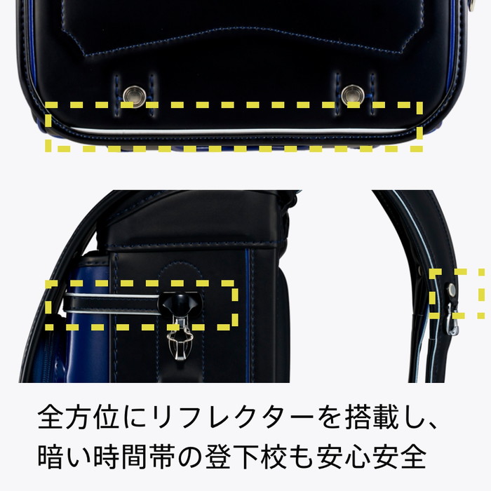 全方位にリフレクターを搭載し、暗い時間帯の登下校も安心安全です。控え目ですが、夜はしっかり光を反射します。