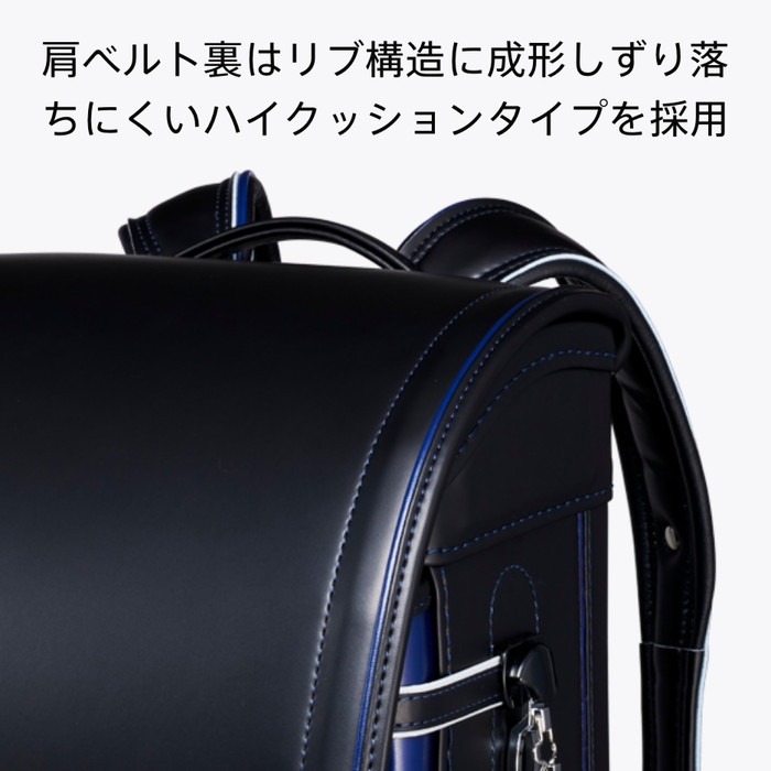 肩ベルトの付け根が上向きになるふわりぃ背カンを採用。背負った際にランドセルが斜め後ろに引っ張られて背中から離れてしまう事を抑制し、体感重量が軽くなります。
