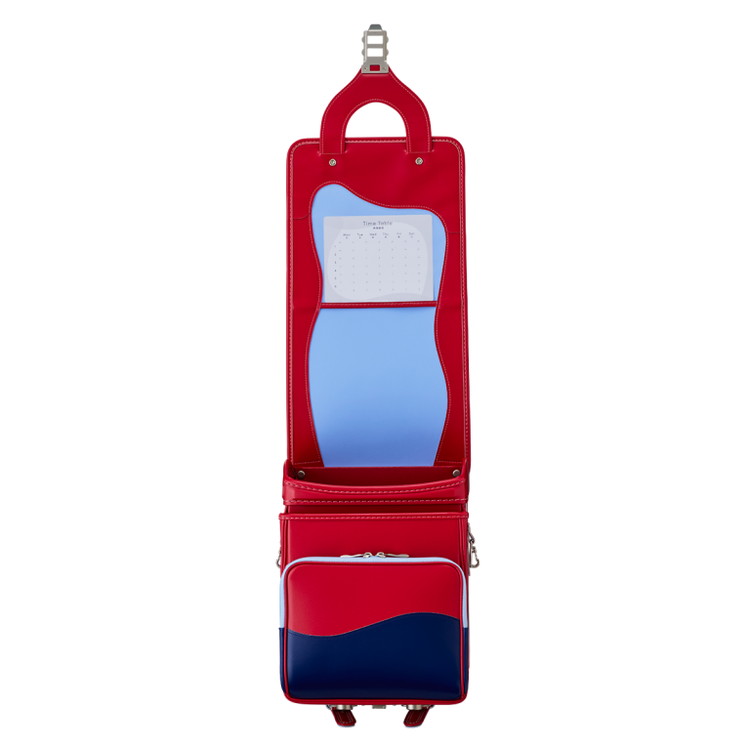 かぶせ部分には3色の生地を使用。ランドセルでは珍しいデザイン。とても個性的です。
