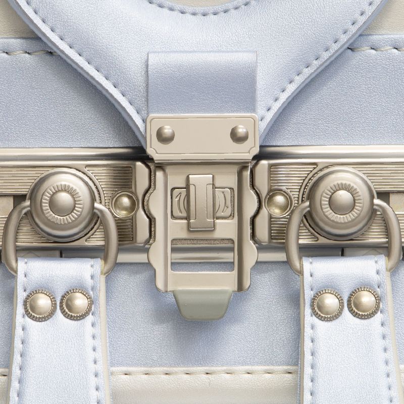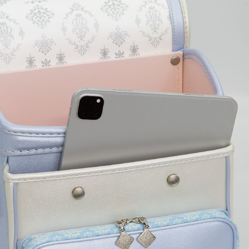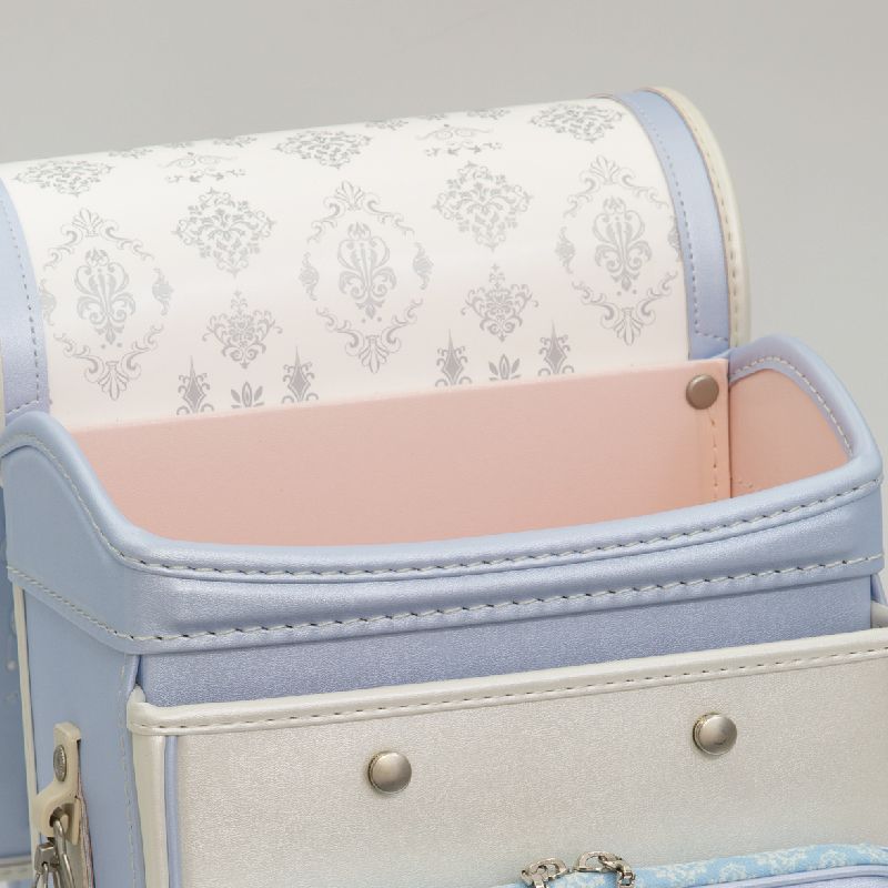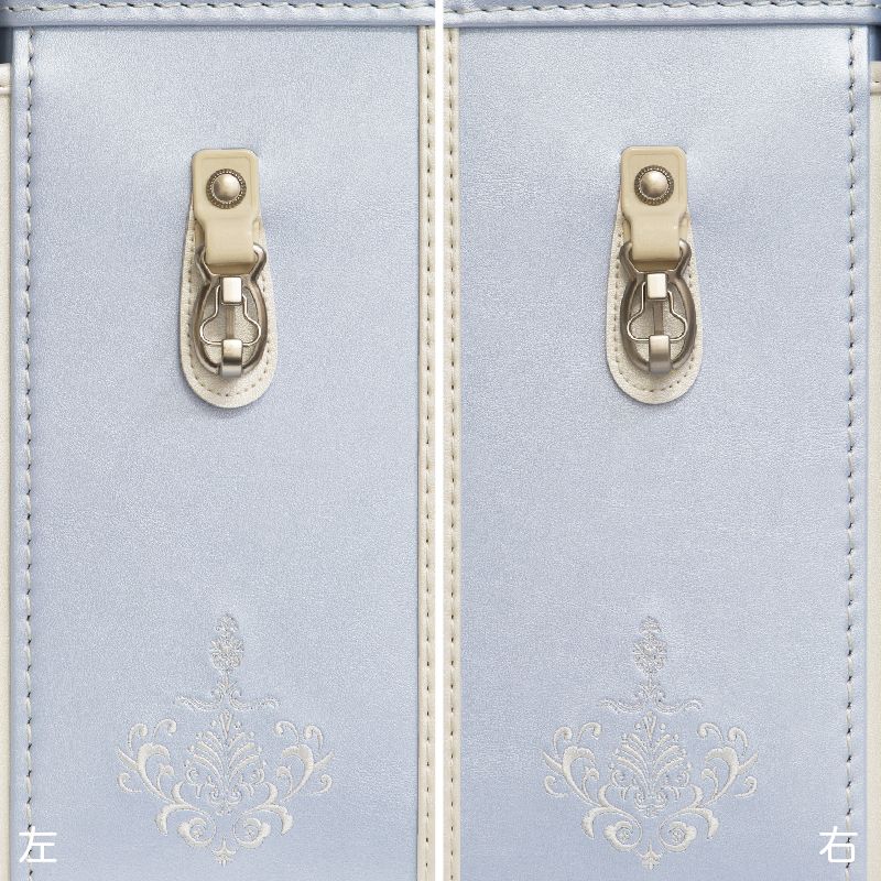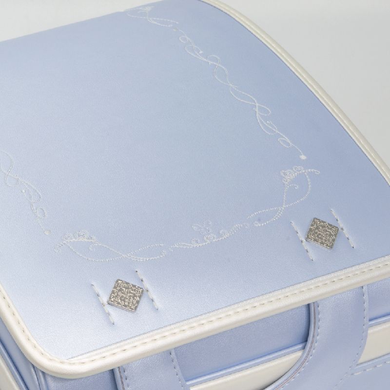 素材はパール調のクラリーノレミニカパール。サイドの刺繍も美しい。カブセ下や持ち手、肩ベルトなど、全方向に反射材を配置し、暗がりでの安全性を確保。憧れのドレスをまとうように背負いたいランドセルです。
