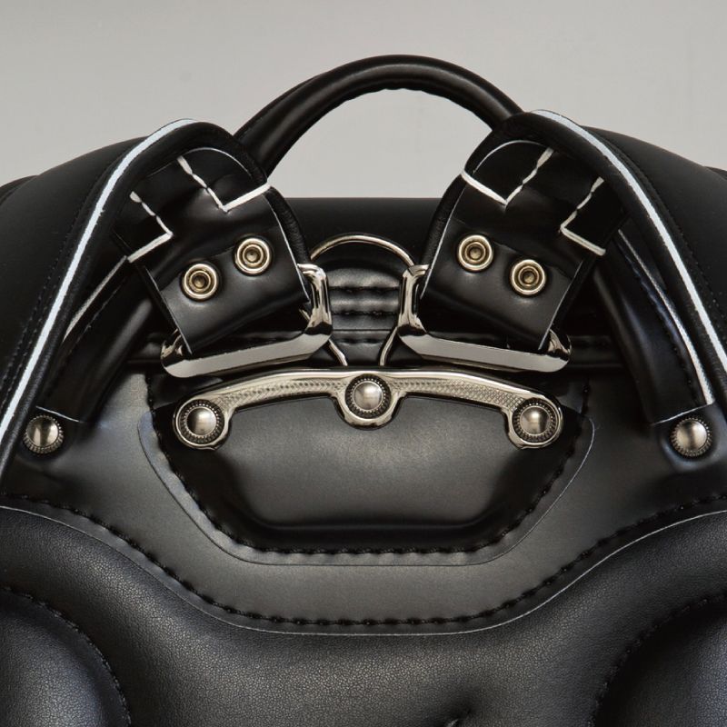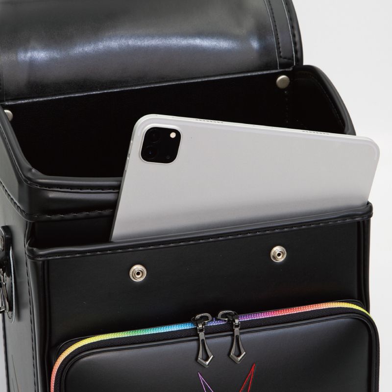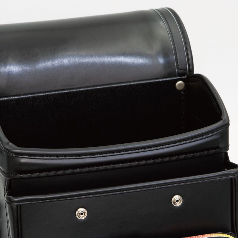 外側だけではなく、内装や背当ての裏も黒。反射材やレインボーカラーをひきたてます。