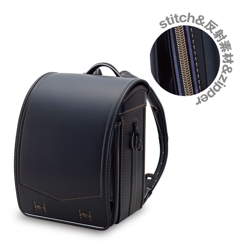カブセも大マチも内装も黒。素材は傷に強く軽い「クラリーノタフロックNEO」。ステッチの色やファスナーのカラーがアクセントとなっています。カブセ下には反射材。肩ベルトや側面の反射材とともに、暗がりでの安全を確保。