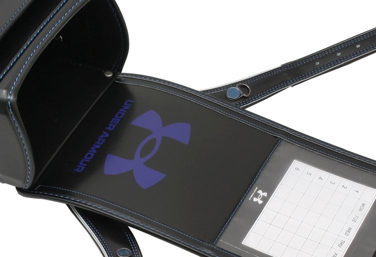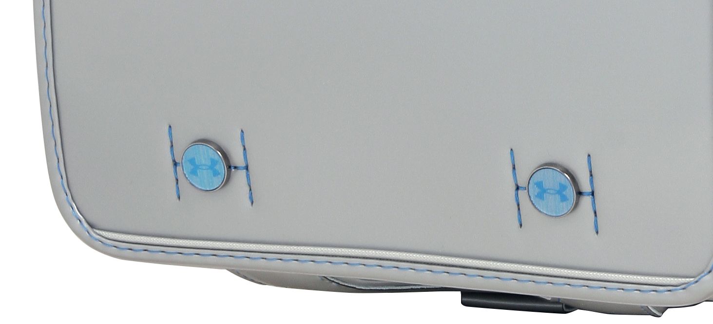 サイドやカブセ裏の「アンダーアーマー」ロゴ。随所にブランドモチーフがちりばめられています。ブランドモチーフやカブセ下のテープは反射材で、暗がりでの視認性を高めています。