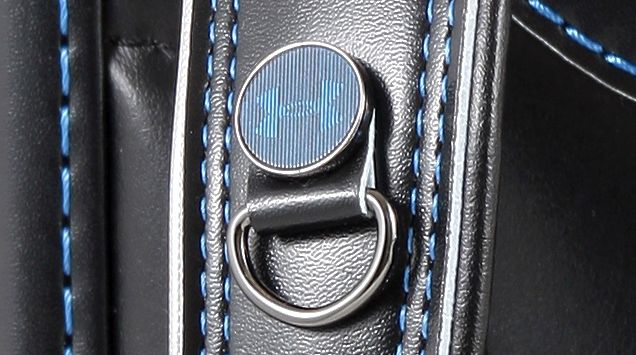 カブセと肩ベルトの鋲には、見る角度によって色が変わる鋲が使われています。遊び心いっぱいのパーツです。