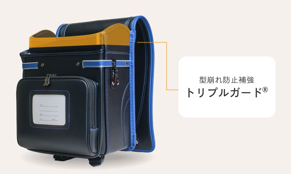 型崩れ防止補強として、芯材自体を三方向に縫い合わせて補強した「トリプルガード®」を採用しています。型崩れ防止補強として、大マチの上部に丈夫な補強材を使用した「しっかりくん®」を採用。内部に特殊な樹脂でできたプレートを芯材として採用し、しなやかさと強度を両立しています。目に見えない場所だからこそのこだわりです。