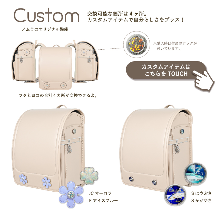 ランドセルのカブセ下部ホック(2つ)と両サイド上部ホック(各ひとつずつ)が取り外し可能です。別売りの専用カスタマイズアイテム(1個500円)を購入していただければ、さらにカッコ良く、かわいらしく、ランドセルをカスタマイズできます。