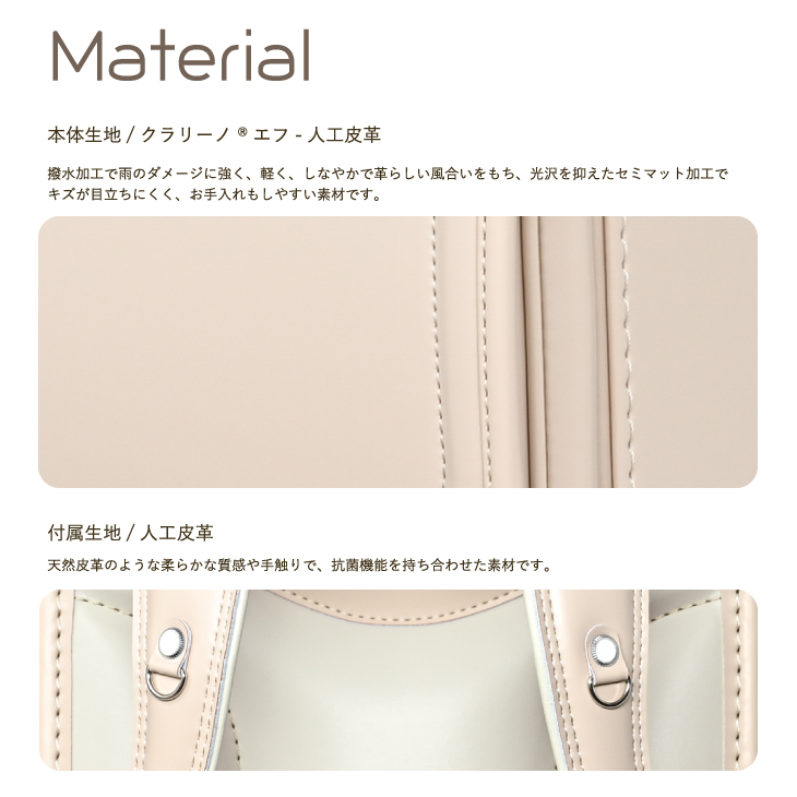 本体:クラリーノ・エフ(撥水加工ツヤ消しタイプ)  背裏・肩ベルト裏:クラリーノ(人工皮革)