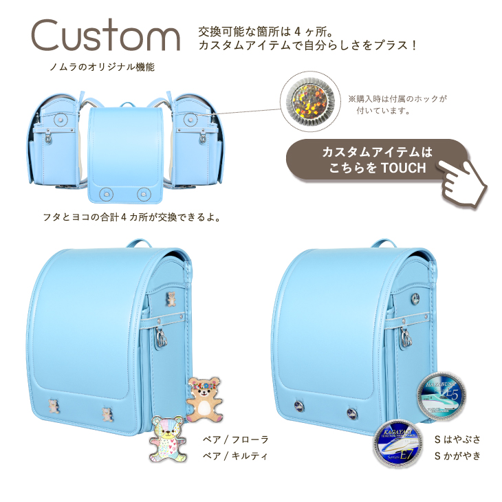 ランドセルのカブセ下部ホック(2つ)と両サイド上部ホック(各ひとつずつ)が取り外し可能です。別売りの専用カスタマイズアイテム(1個500円)を購入していただければ、さらにカッコ良く、かわいらしく、ランドセルをカスタマイズできます。