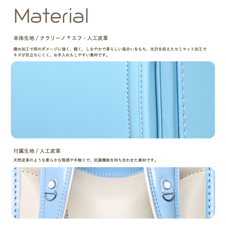 本体:クラリーノ・エフ(撥水加工ツヤ消しタイプ)  背裏・肩ベルト裏:クラリーノ(人工皮革)