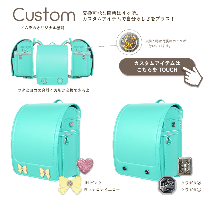 ランドセルのカブセ下部ホック(2つ)と両サイド上部ホック(各ひとつずつ)が取り外し可能です。別売りの専用カスタマイズアイテム(1個500円)を購入していただければ、さらにカッコ良く、かわいらしく、ランドセルをカスタマイズできます。