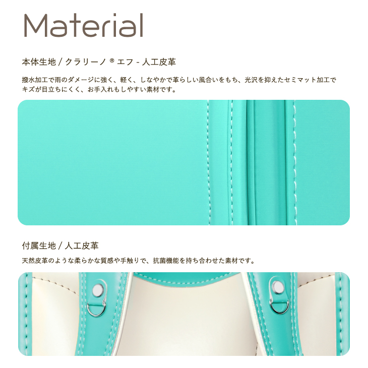 本体:クラリーノ・エフ(撥水加工ツヤ消しタイプ)  背裏・肩ベルト裏:クラリーノ(人工皮革)