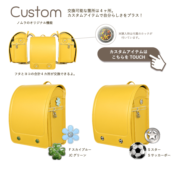ランドセルのカブセ下部ホック(2つ)と両サイド上部ホック(各ひとつずつ)が取り外し可能です。別売りの専用カスタマイズアイテム(1個500円)を購入していただければ、さらにカッコ良く、かわいらしく、ランドセルをカスタマイズできます。