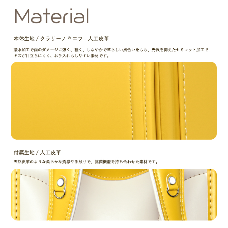 本体:クラリーノ・エフ(撥水加工ツヤ消しタイプ)  背裏・肩ベルト裏:クラリーノ(人工皮革)