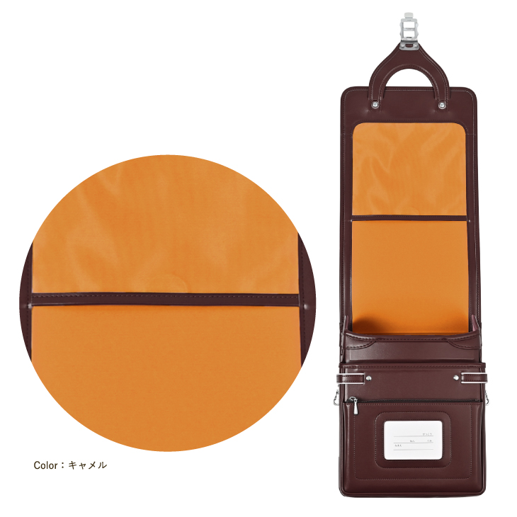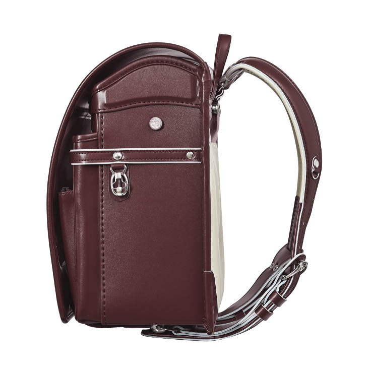ランドセルのサイドには片サイドにDカン、反対のサイドにナスカンが付いていて便利です。両方の肩ベルトには防犯ブザーなどが吊り下げられるDカン付き。このDカンに使用している鋲は、夜間に車のライトなどで反射する反射鋲になっています。もちろん、カスタマイズできるホックも反射鋲になっています。また、ランドセル中央の帯部分にも反射テープを使用。
