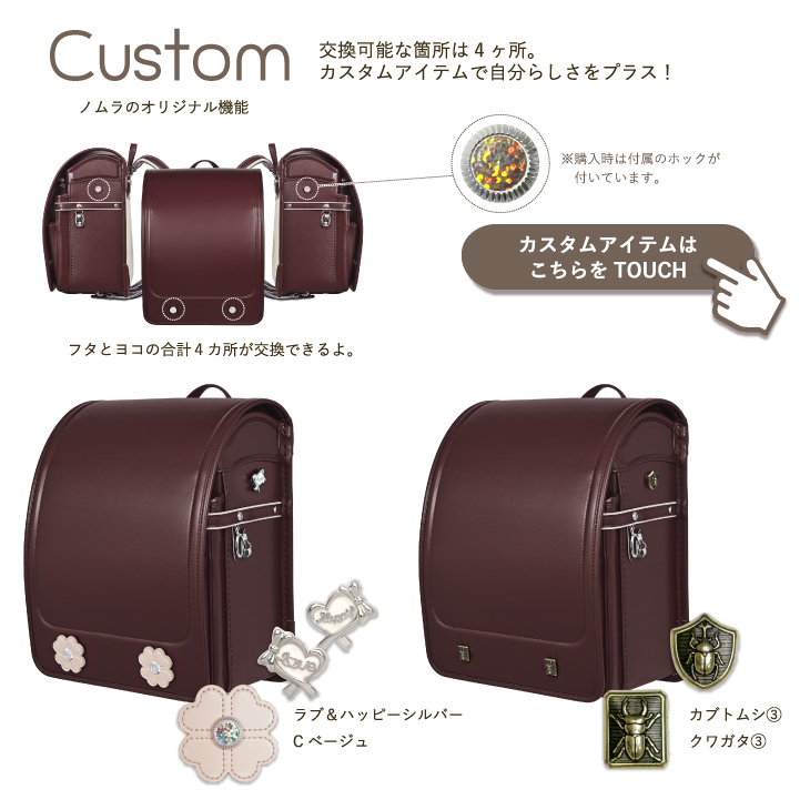 ランドセルのカブセ下部ホック(2つ)と両サイド上部ホック(各ひとつずつ)が取り外し可能です。別売りの専用カスタマイズアイテム(1個500円)を購入していただければ、さらにカッコ良く、かわいらしく、ランドセルをカスタマイズできます。