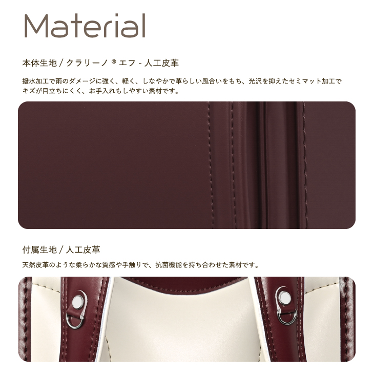 本体:クラリーノ・エフ(撥水加工ツヤ消しタイプ)  背裏・肩ベルト裏:クラリーノ(人工皮革)